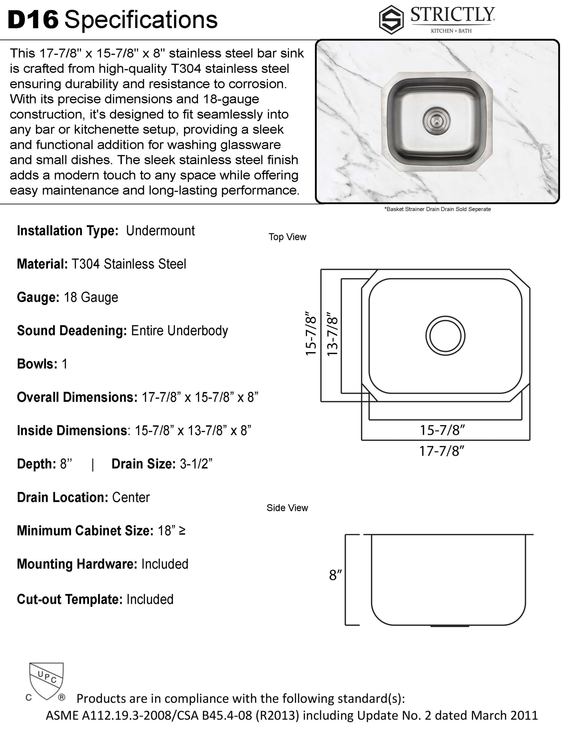 1 review for 17-7/8″ x 15-7/8″ x 8” Stainless Steel Undermount Single Bowl Kitchen, Bar, and Prep Sink with Center Drain – D16