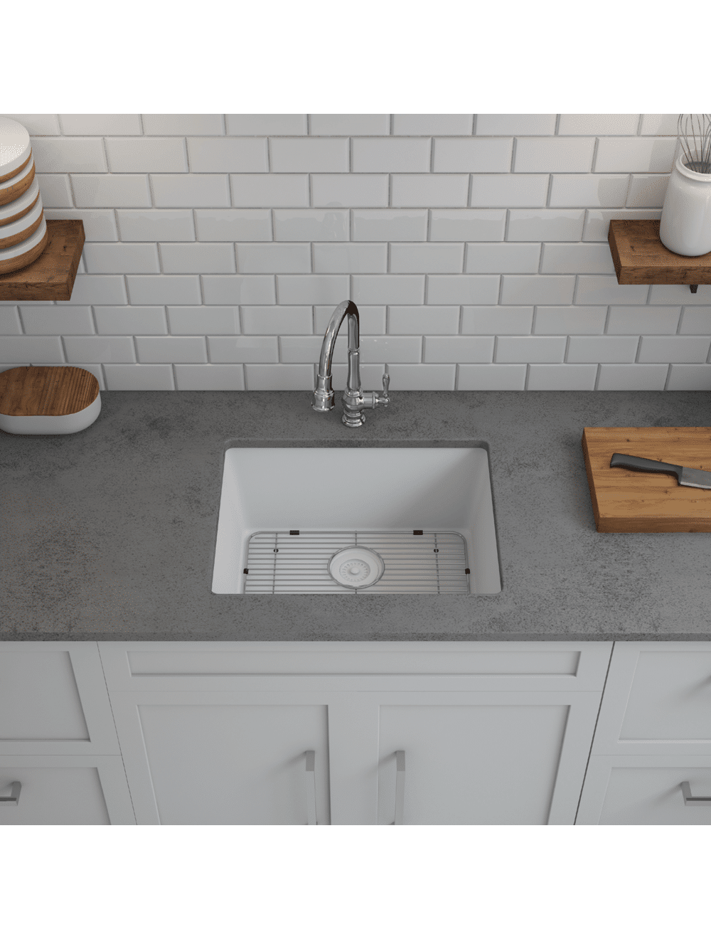 It is easy to maintain and clean and offers a more natural essence to your kitchen workspace. Though its heat resistant, we prefer you use our handy Rolling Rack to cool down your off-the-stove pots and pans. It redirects the heat transfer so you don’t risk heat damage to your sink or countertops. One of the nicest things about our quartz sink is that even if they scratch they will not be visibly shown with the damage because they’re colored all the way through. Our sink is easy to clean and you can find more information about cleaning and maintaining your sink below. Lastly, it’s fully insulated and equipped with a natural stone sound dampener.