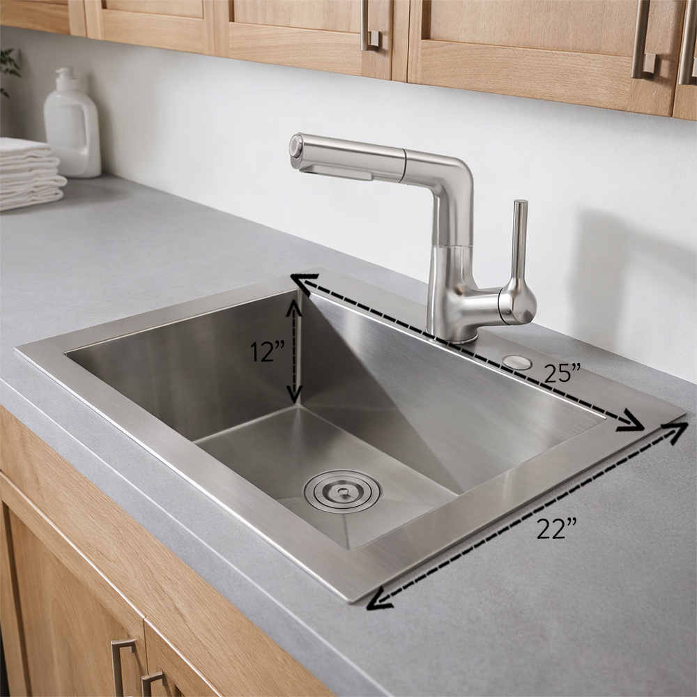 25″ x 22″ x 12″ Stainless Steel Dual Mount Laundry Sink – Single Bowl with Off-Center Drain