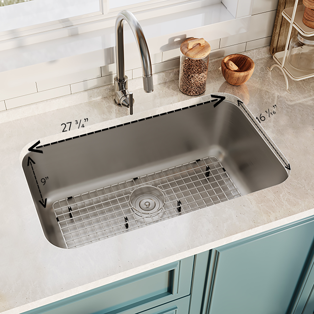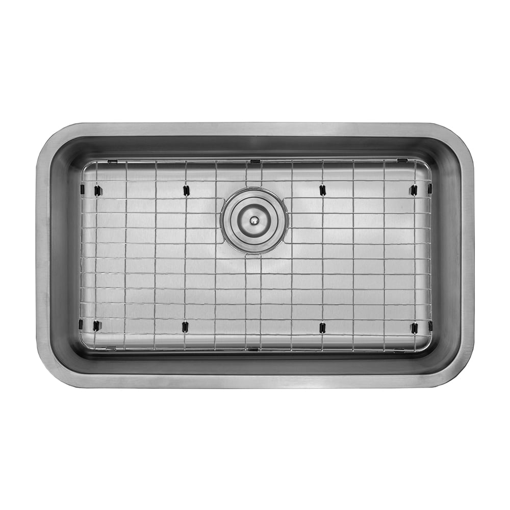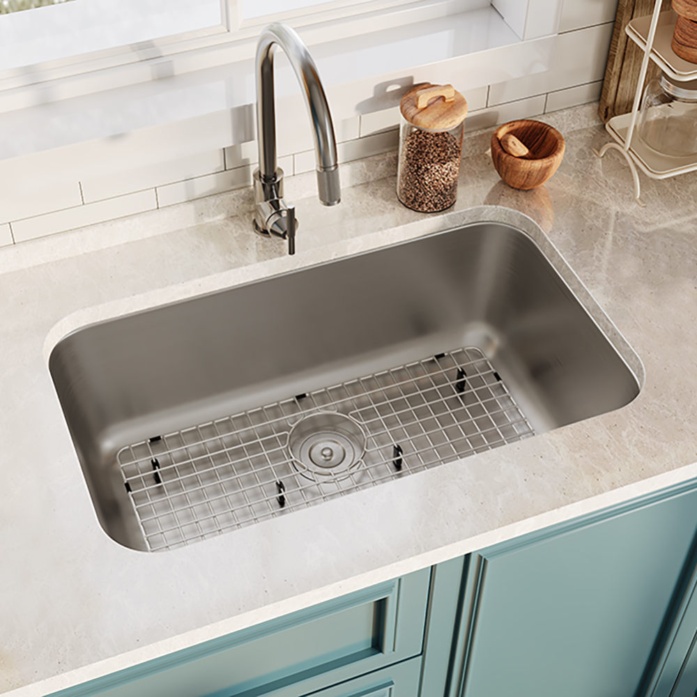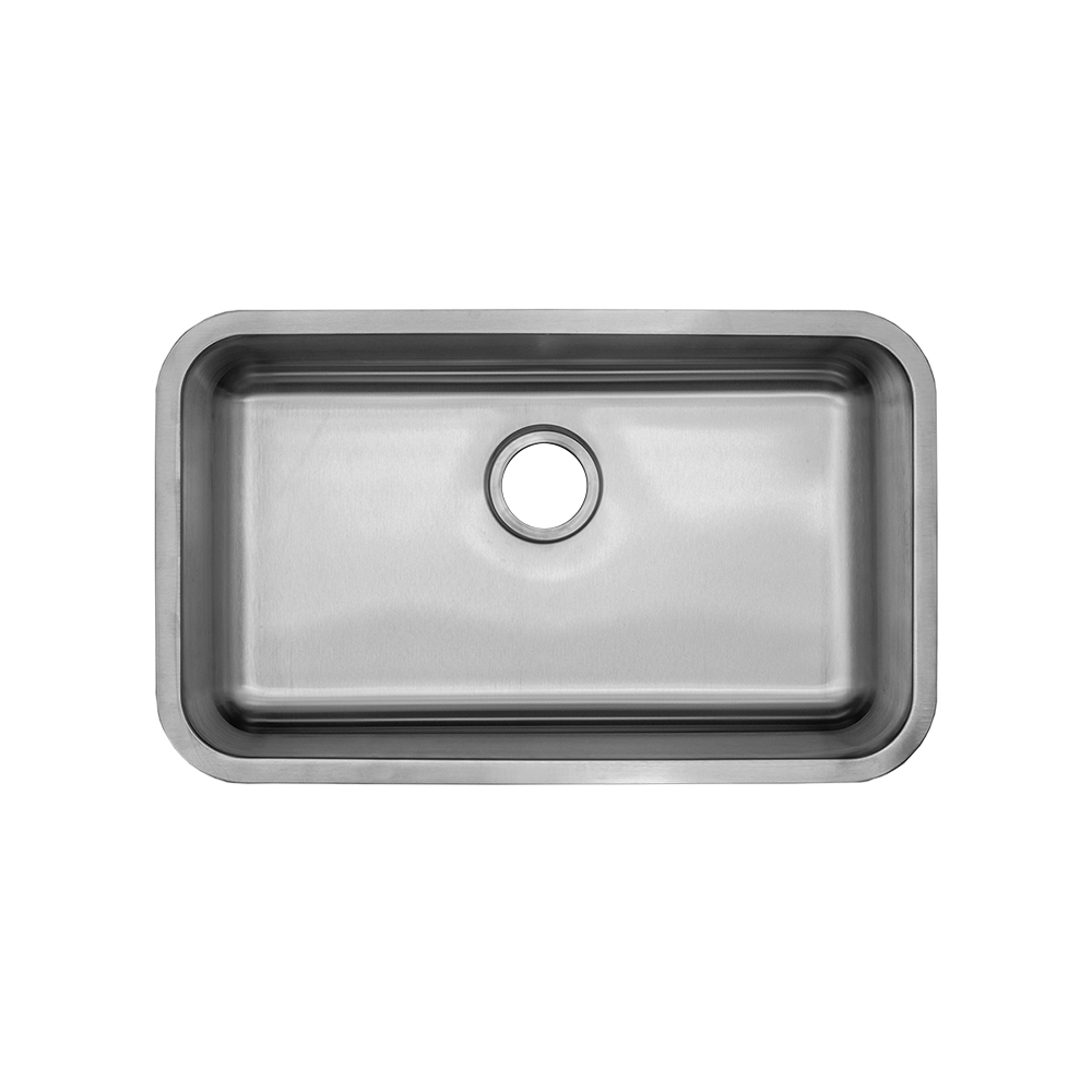 Traditional style stainless steel undermount single bowl sink with rounded easy-clean corners.