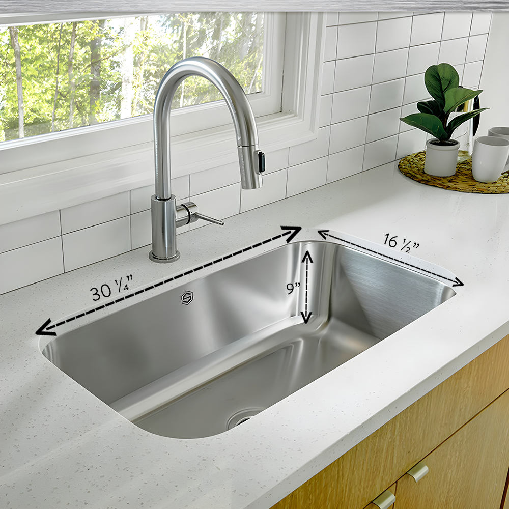 Upgrade your kitchen with our 32-3/8″ x 18-1/2″ x 9″ Stainless Steel Single Bowl Kitchen Sink, expertly designed for both aesthetics and functionality. Made from robust 18-gauge or 16-gauge stainless steel, this sink features a stylish brushed finish that resists scratches and wear, ensuring long-lasting beauty. The innovative off-center drain maximizes bowl space, making it ideal for handling large pots and dishes.