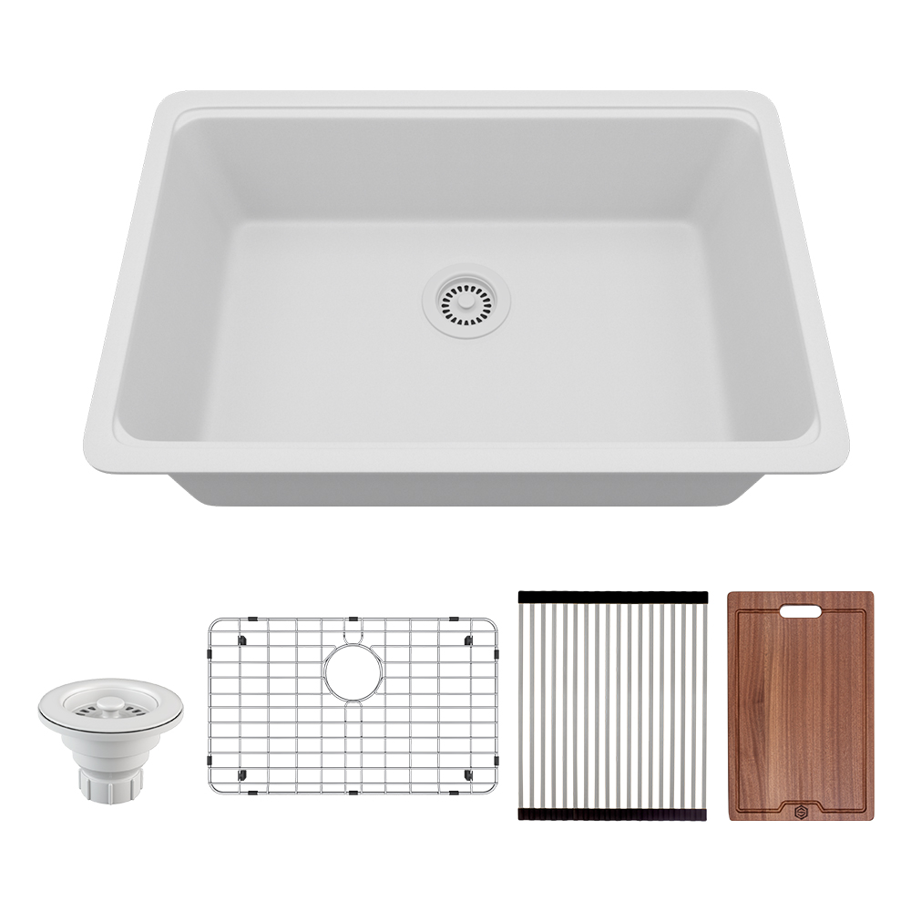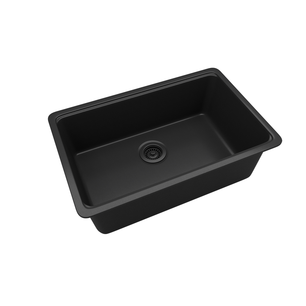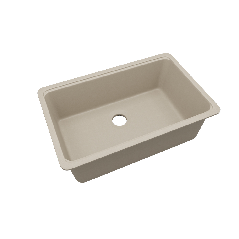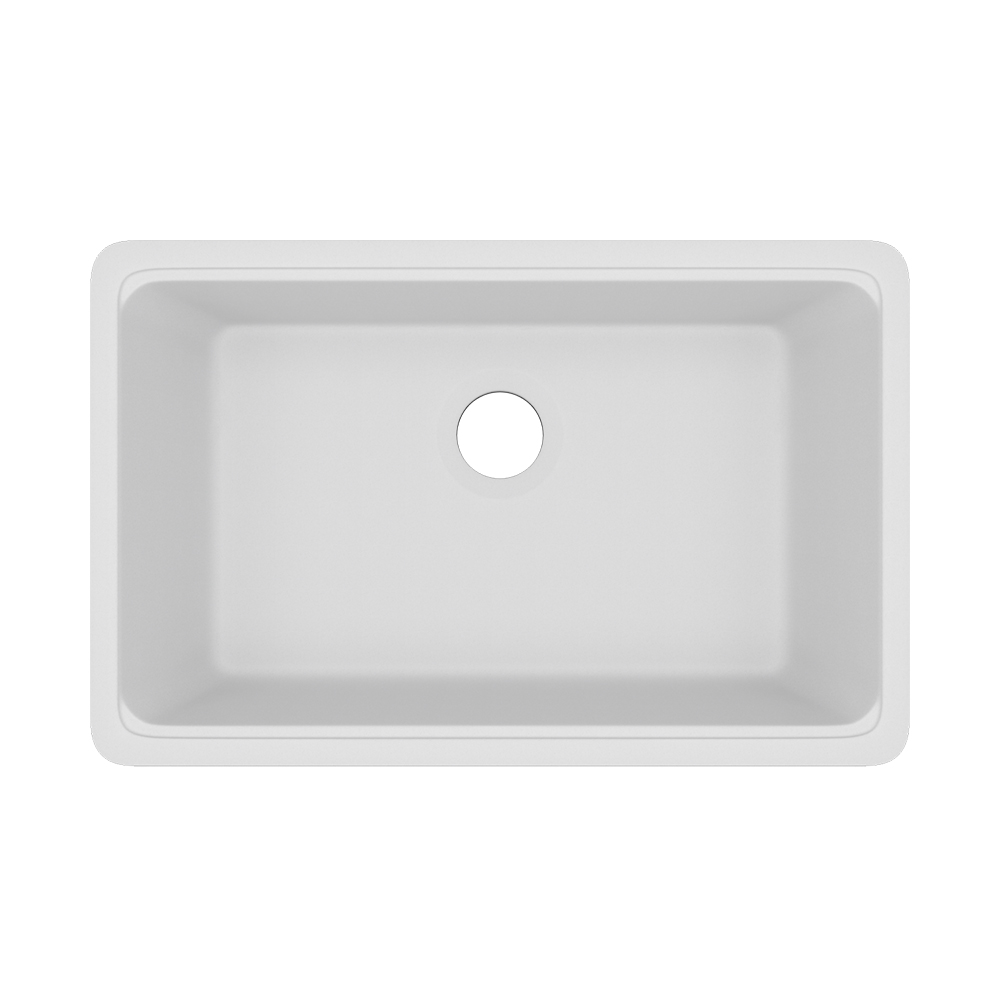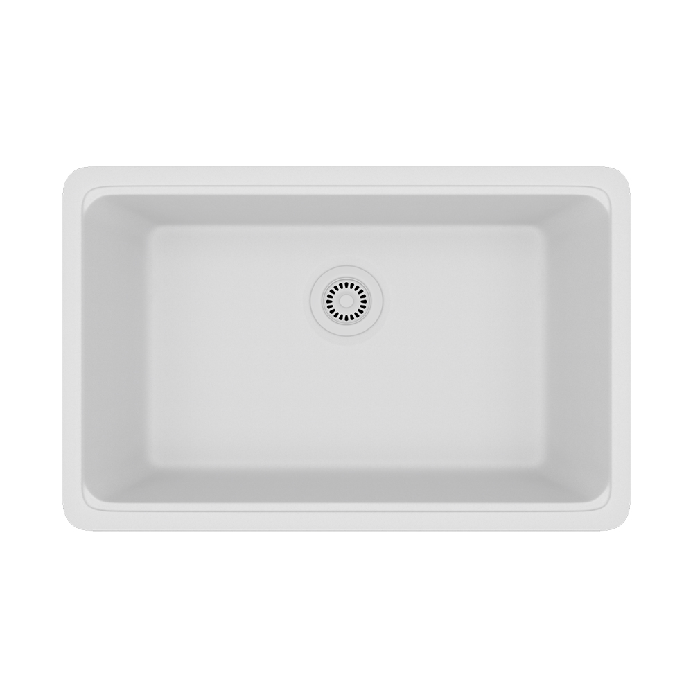 The Q28WS is a high-performance quartz composite sink designed to bring both style and durability to your kitchen. Measuring 29 ¾″ wide by 19″ front-to-back with a 10 ¼″ deep basin, it comfortably fits into any cabinet 30″ wide (33″ recommended) and offers an interior bowl size of 27 ¾″ × 17″ × 10 ¼″. Whether you prefer a top-mount or undermount installation, the Q28WS adapts seamlessly to your countertop. Available in five sophisticated hues—Beige, Black, Concrete, Mocha, and White—this sink complements a variety of kitchen palettes and décor schemes. A round, off-center drain provides efficient water flow, and optional accessories are just a click away.