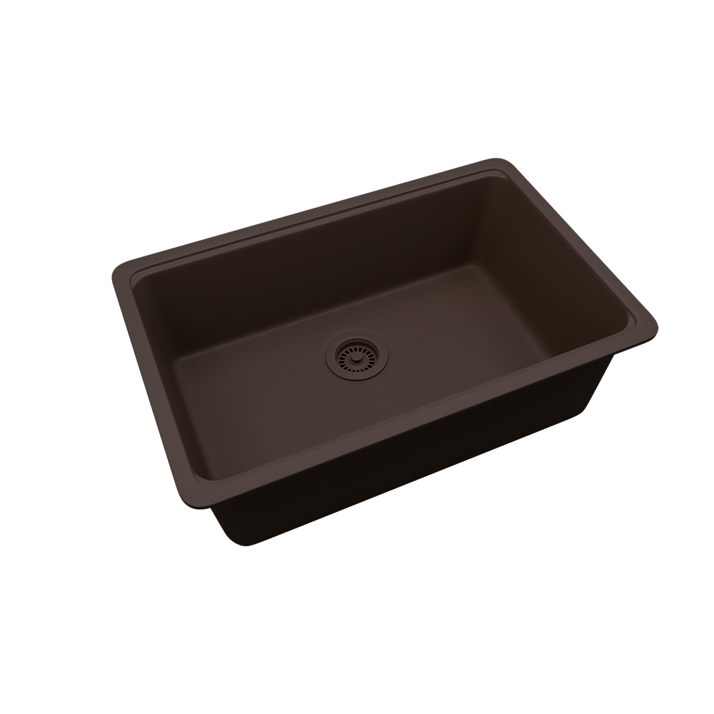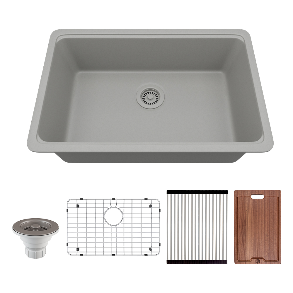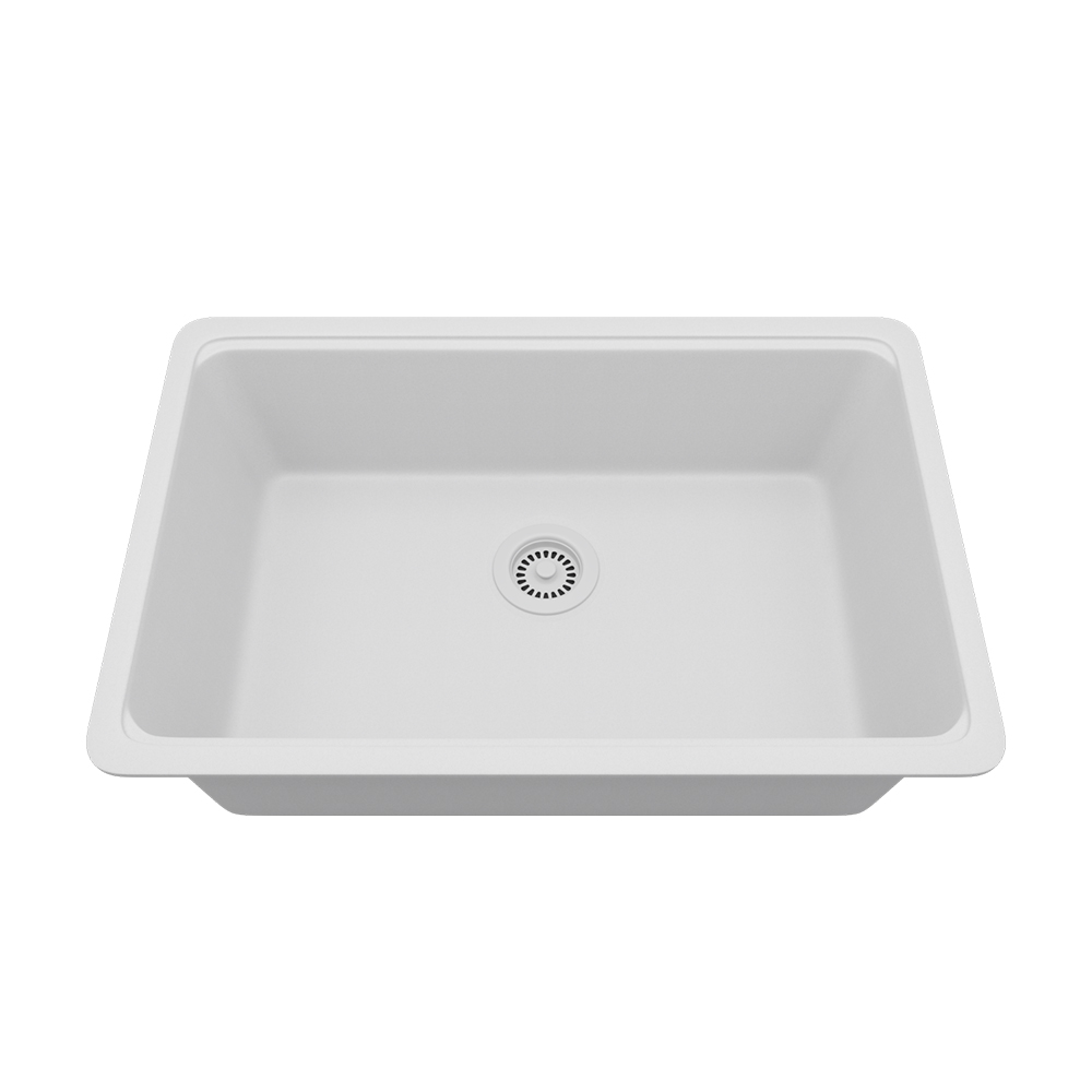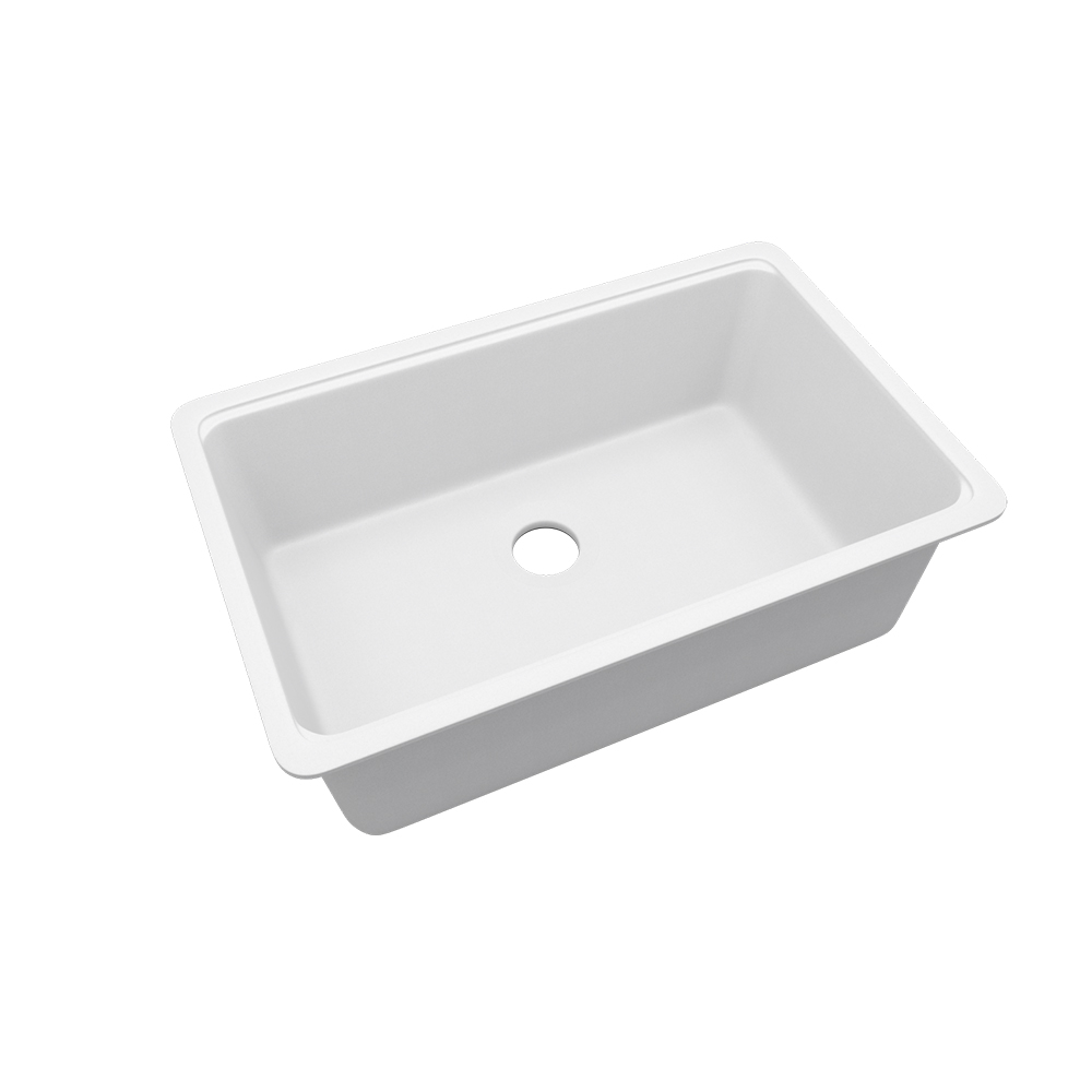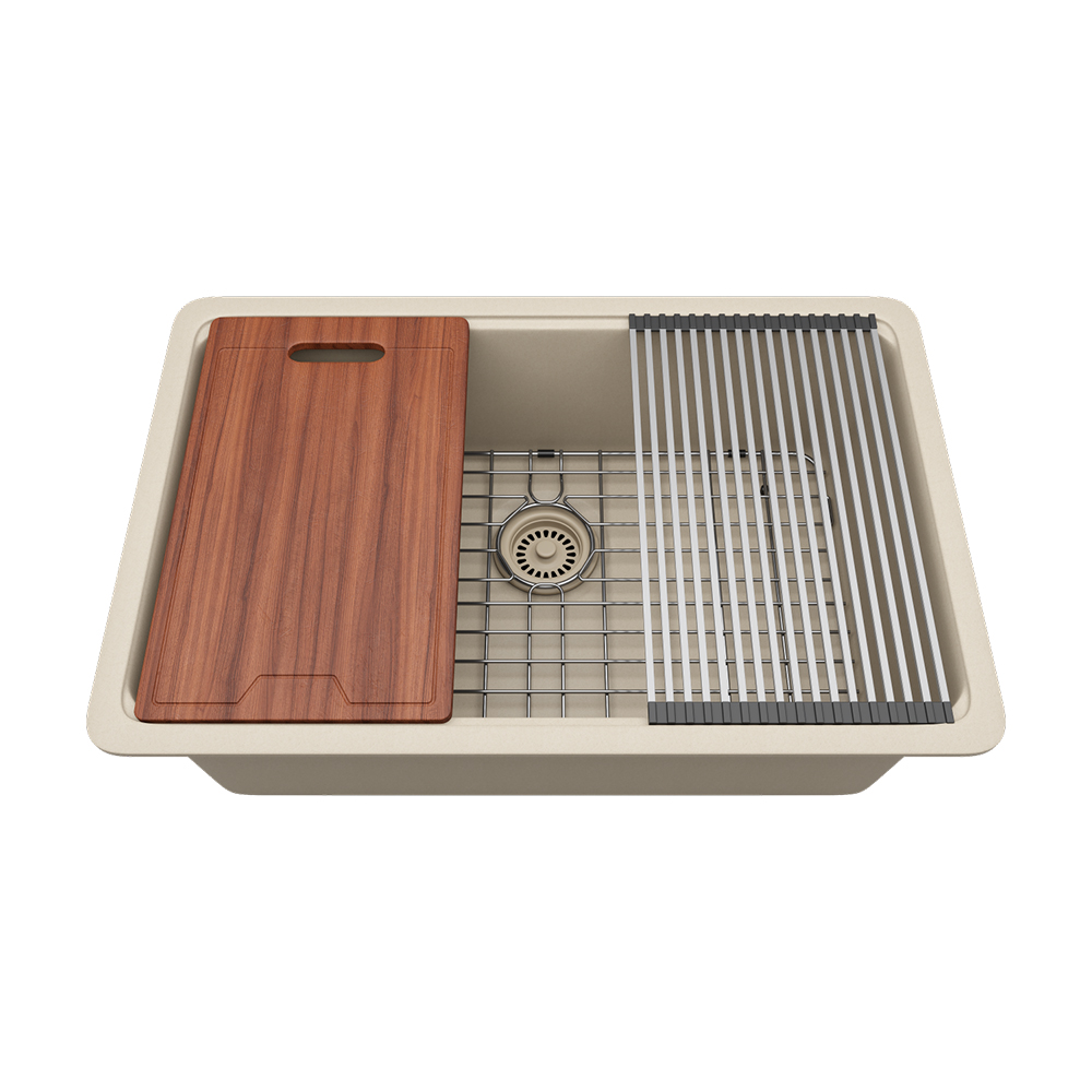 The Q28WS is a high-performance quartz composite sink designed to bring both style and durability to your kitchen. Measuring 29 ¾″ wide by 19″ front-to-back with a 10 ¼″ deep basin, it comfortably fits into any cabinet 30″ wide (33″ recommended) and offers an interior bowl size of 27 ¾″ × 17″ × 10 ¼″. Whether you prefer a top-mount or undermount installation, the Q28WS adapts seamlessly to your countertop. Available in five sophisticated hues—Beige, Black, Concrete, Mocha, and White—this sink complements a variety of kitchen palettes and décor schemes. A round, off-center drain provides efficient water flow, and optional accessories are just a click away.
