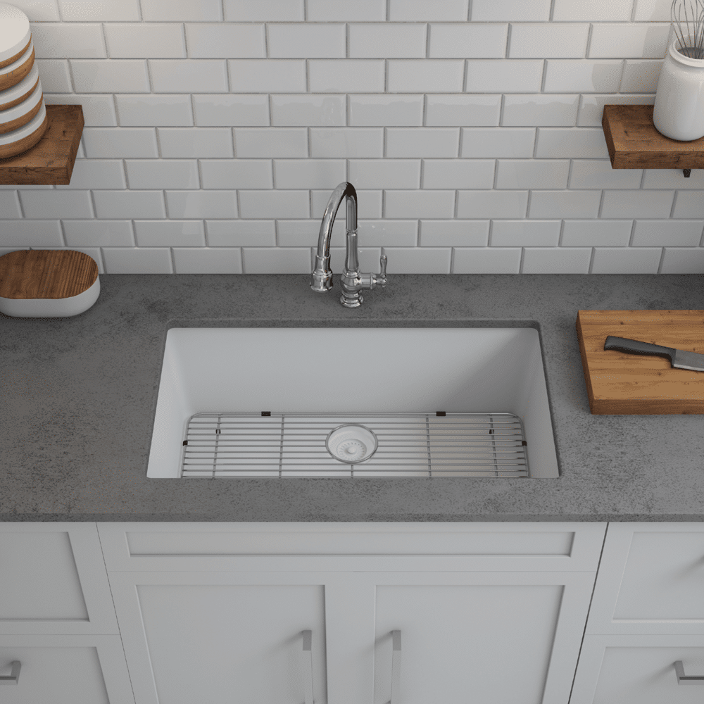 It’s safe to say you’ll love your Quartz Sink in fact, look closely at the texture and you’ll see just how well it will goes with your countertop. Make sure to use a cabinet size of at least 33″ width, we recommend 36″ for easier installation. In addition to its beauty, it also features a stain, heat, and scratch resistant surface. Though its heat resistant, we prefer you use our handy Rolling Rack to cool down your off-the-stove pots and pans. It redirects the heat transfer so you don’t risk heat damage to your sink or countertops. Our sink is easy to clean and you can find more information about cleaning and maintaining your sink below. Lastly, it’s fully insulated and equipped with a natural stone sound dampener.