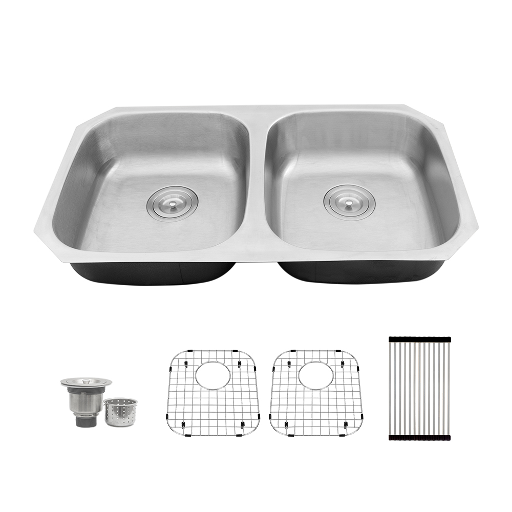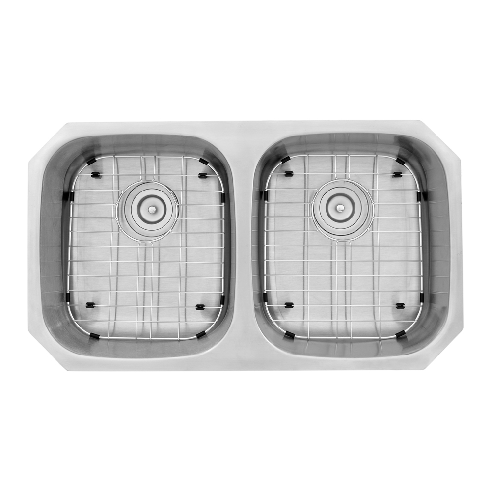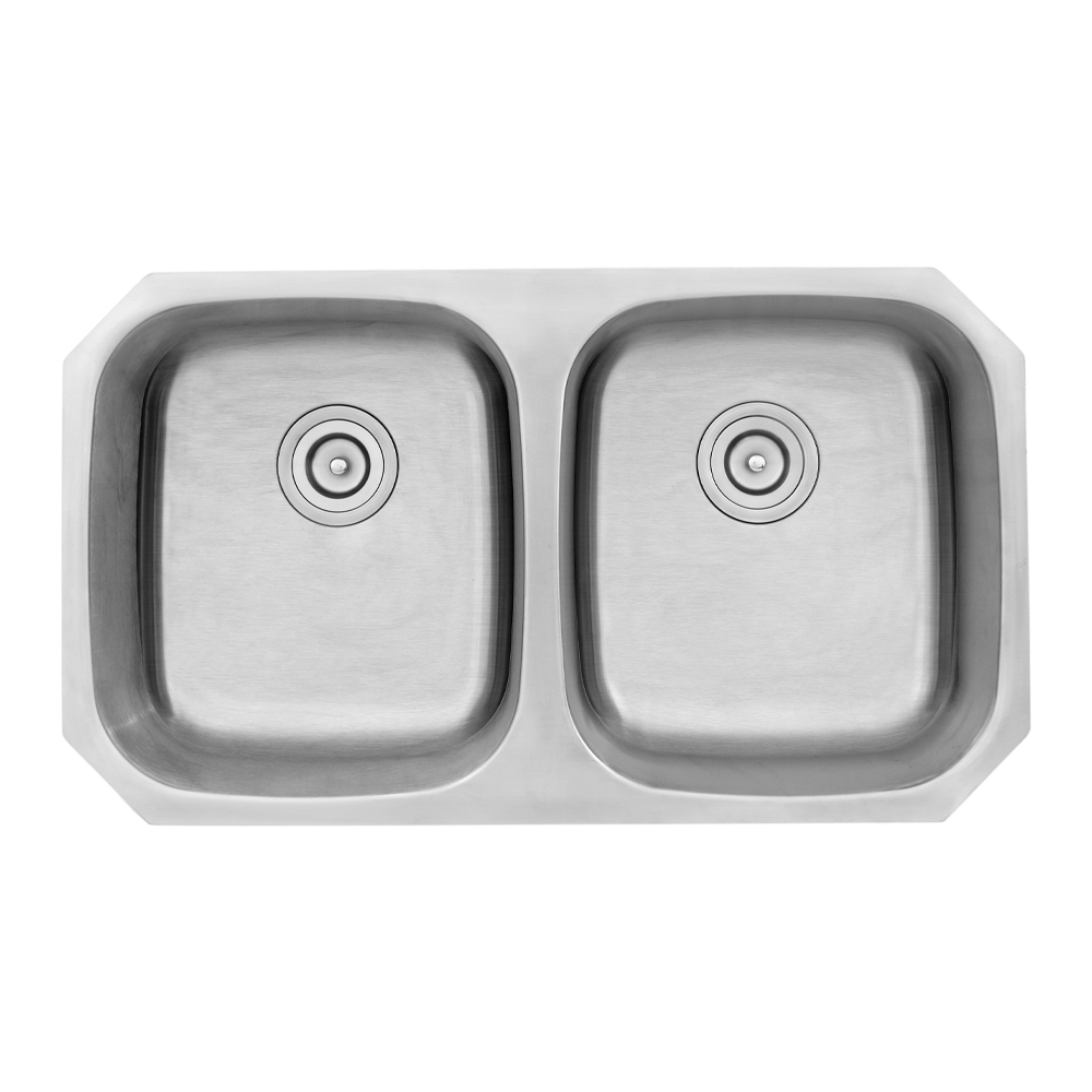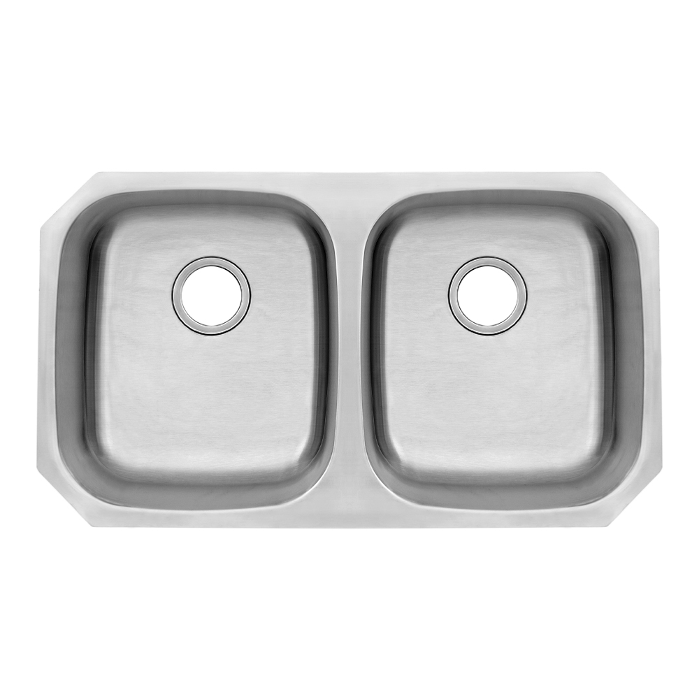 Traditional 18 gauge stainless steel double bowl ADA compliant kitchen sink with easy clean corners.