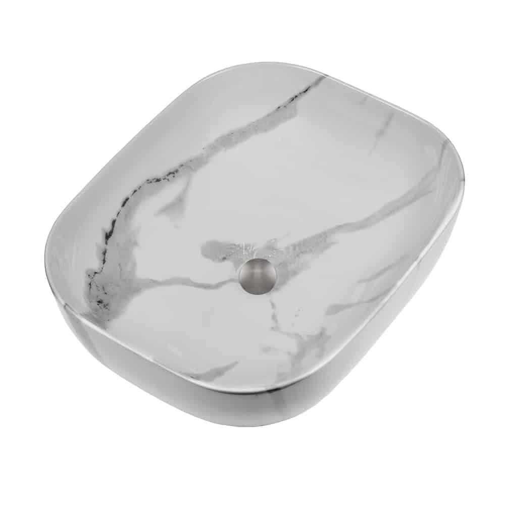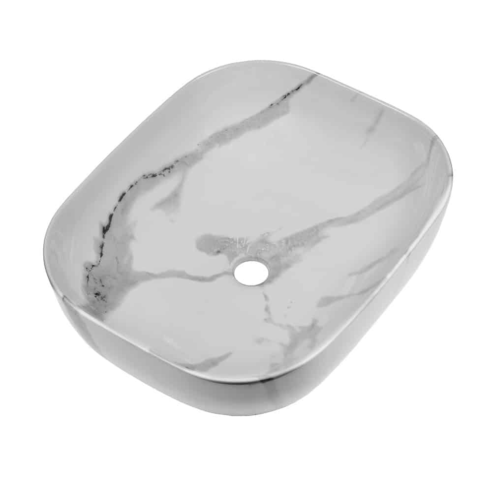 Indulge in unparalleled luxury with our 20″ x 16″ x 5-1/4″ Calacatta White Marble Design Luxury Vessel Sink, meticulously crafted from premium porcelain. Featuring a sleek rounded rectangular shape and adorned with the timeless allure of Calacatta white marble design, this sink exudes opulence. With a glossy finish enhancing its elegance, and a center drain ensuring efficient water flow, it seamlessly blends classic sophistication with modern functionality. Elevate your bathroom to a realm of unmatched refinement with this exquisite centerpiece.