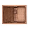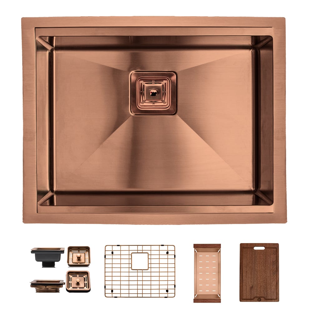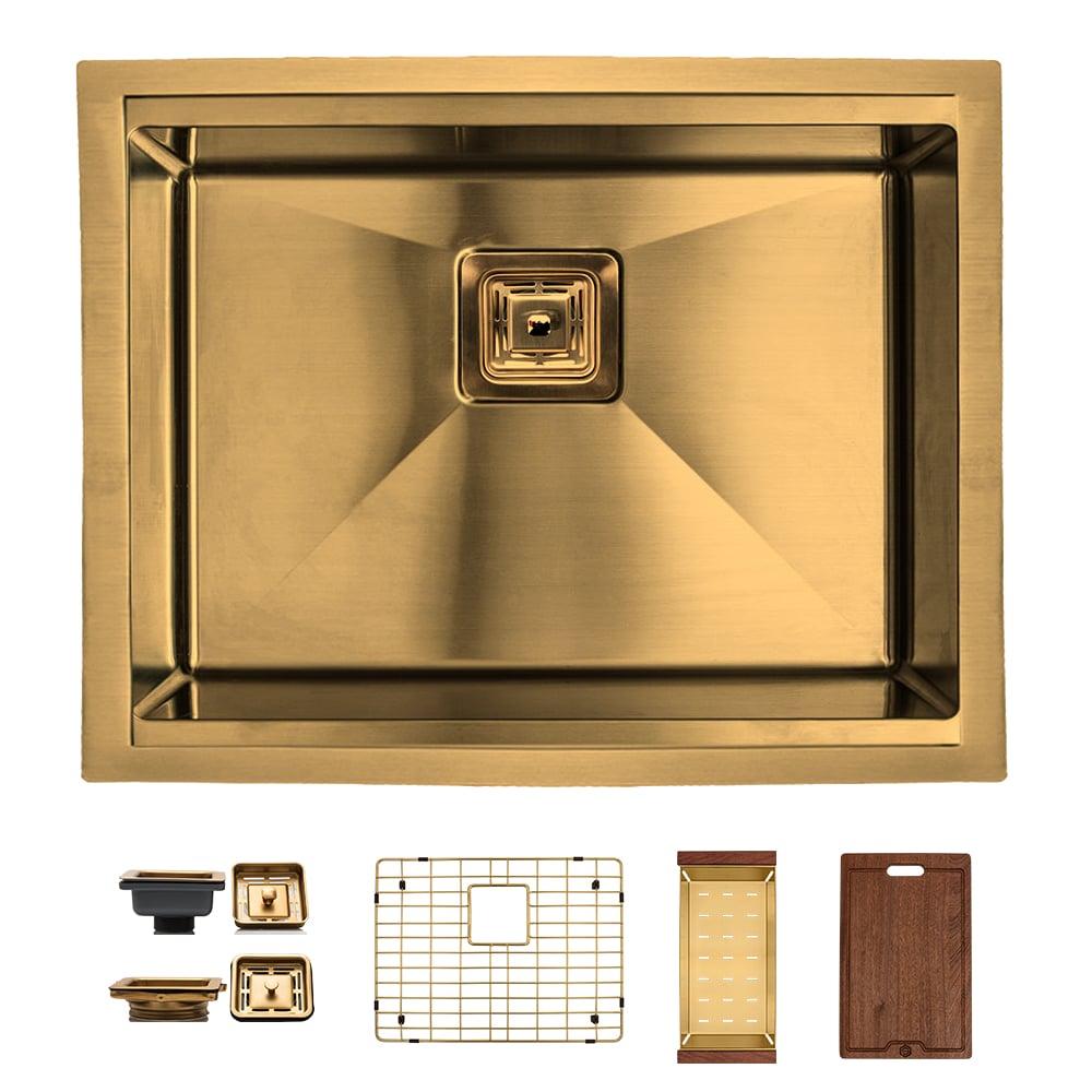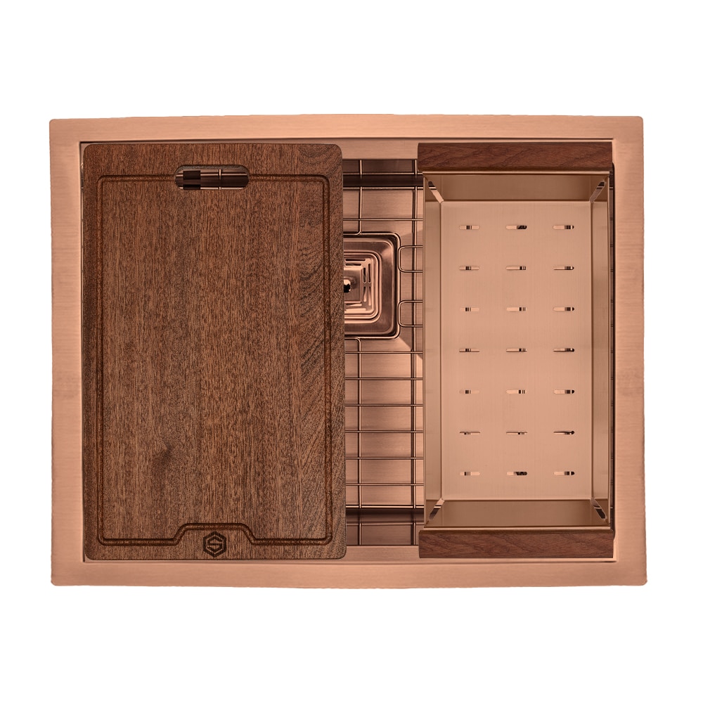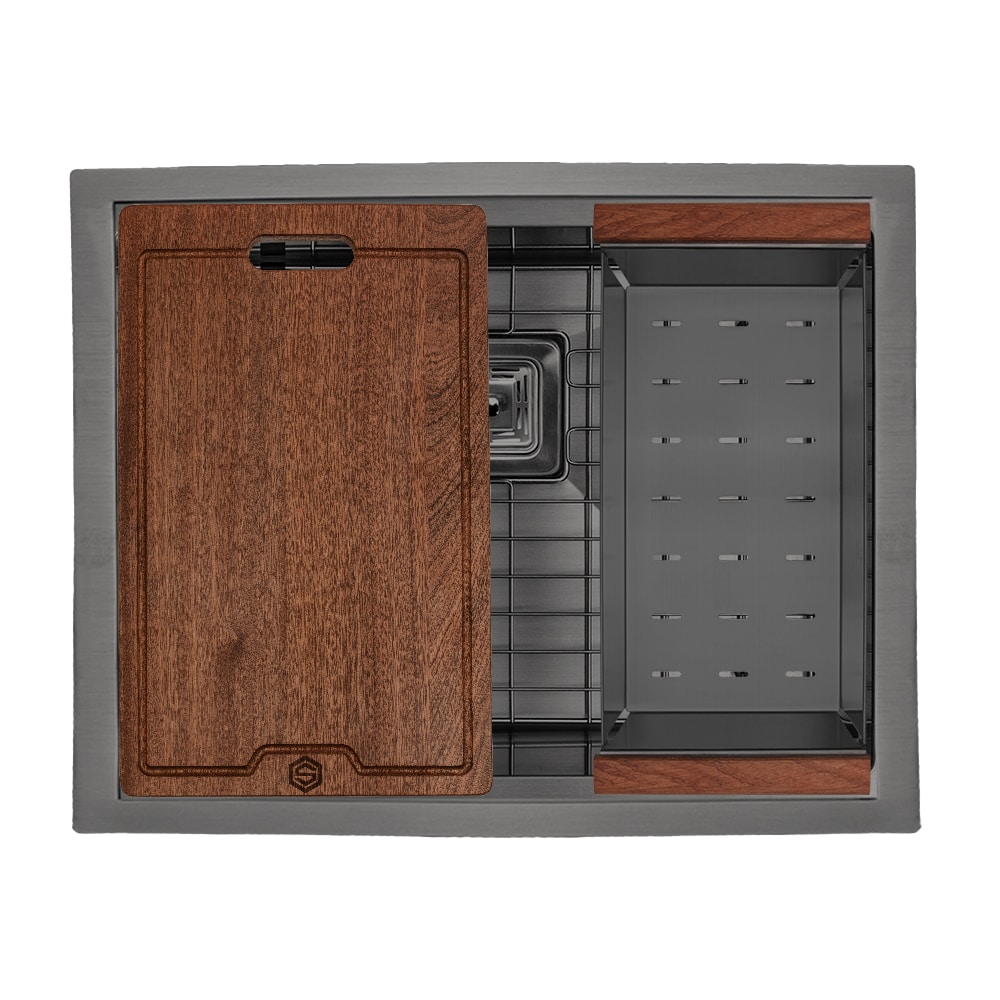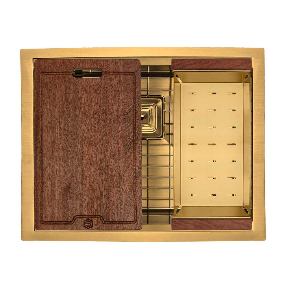 Standard Kit: 1 Square Strainer Drain, 1 Square Disposal Drain, 1 Stainless Steel Grid, 1 Wood Cutting Board, and 1 Stainless Steel Colander with Wood Handles