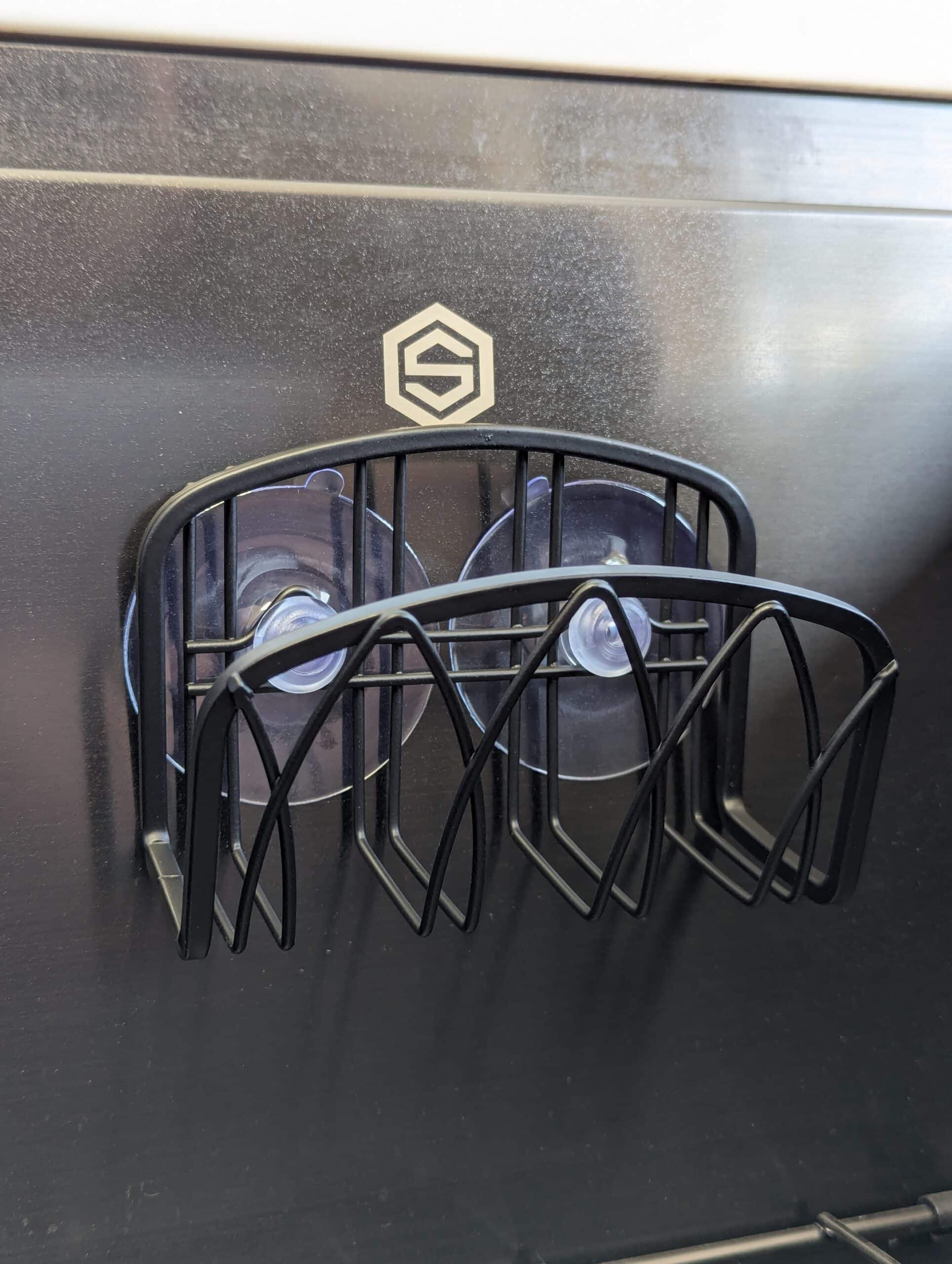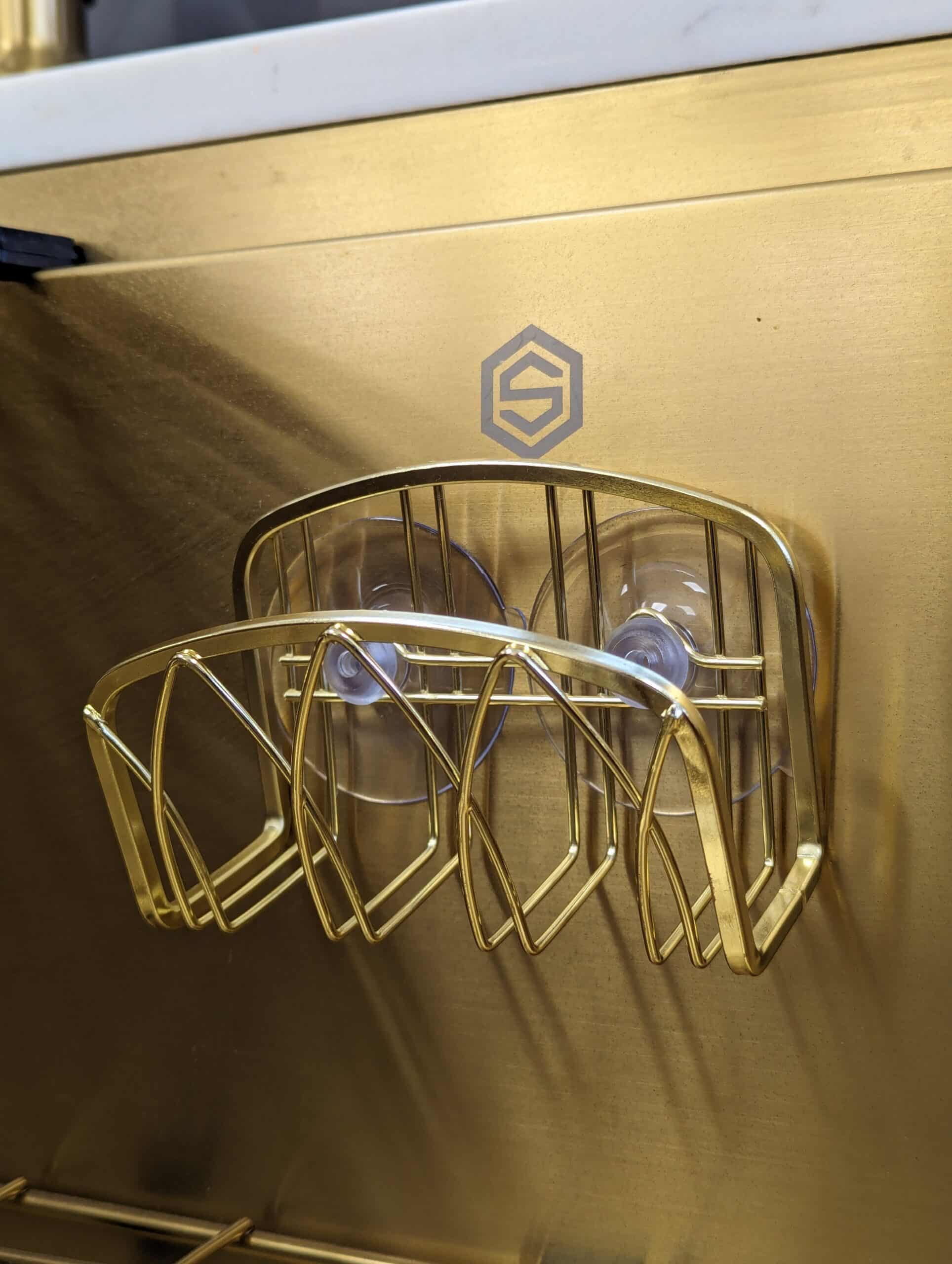 Stainless steel sponge holder blends exceptionally well with all our finishes in Brushed Nickel, Chrome, Black, Copper, and Gold.