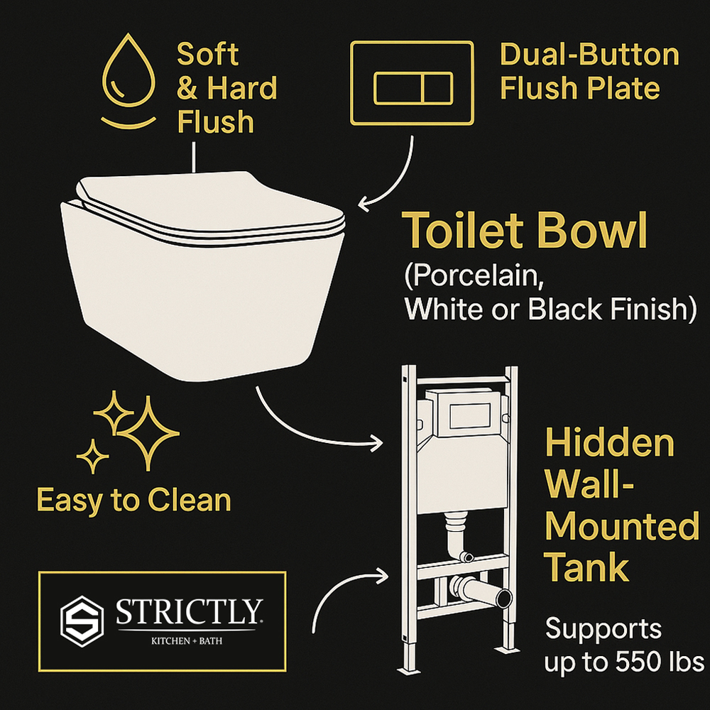 This sleek wall-hung toilet—available in glossy white or matte black—combines contemporary style with thoughtful functionality. Its soft-close seat gently lowers and quickly detaches for effortless cleaning, while the required in-wall tank (sold separately) delivers both hard and soft flush options to balance performance and water savings. Adjustable installation brackets let you fine-tune the seat height for optimal ergonomics, and the concealed P-trap/S-trap connection ensures reliable drainage and a clean, minimalist profile. Ideal for modern bathrooms seeking space-saving elegance and easy maintenance