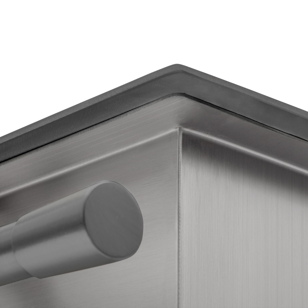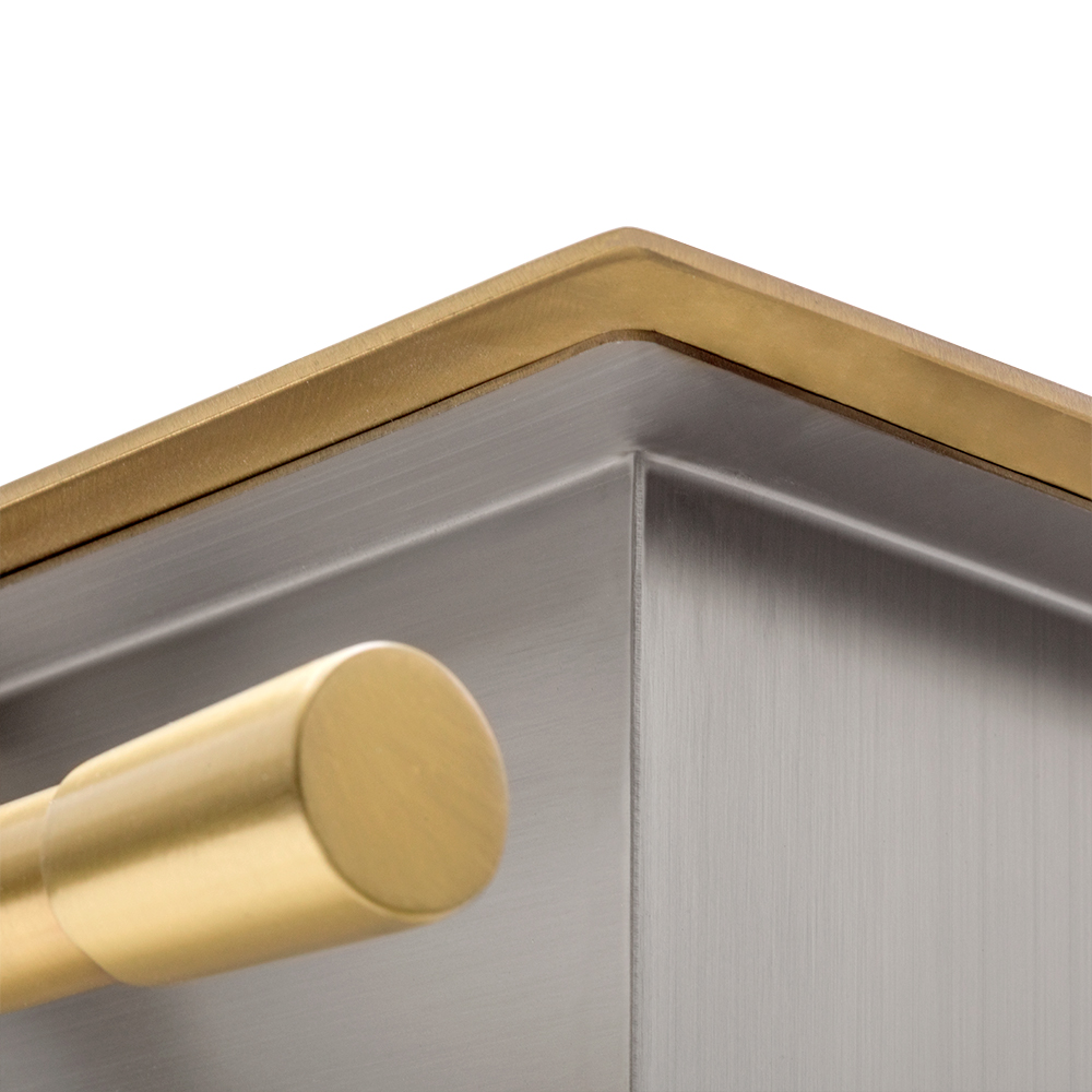 Our most desired sink, due to the front that protrudes with a conveniently placed designer towel bar. The shape and metal in which it is made is two tone and requires meticulous artisanal attention to detail. The edge extends a few centimeters over the countertop like many apron style sinks. The sink is hand-made to mend the two metal types together for a perfect seal and offers a unique design around the rim of the sinks flange and edges of the basins exterior corners.